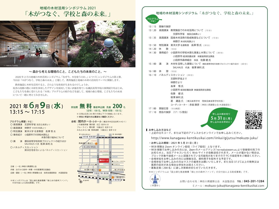 神奈川県建築士会が、昨年2月の地域の木材活用シンポジウム「なぜ今、木を使うのか。」に続くシンポジウムの第2弾、今回は「木がつなぐ、学校と森の未来。」と題して、教育施設と地域の木材の活用をテーマに開催します。